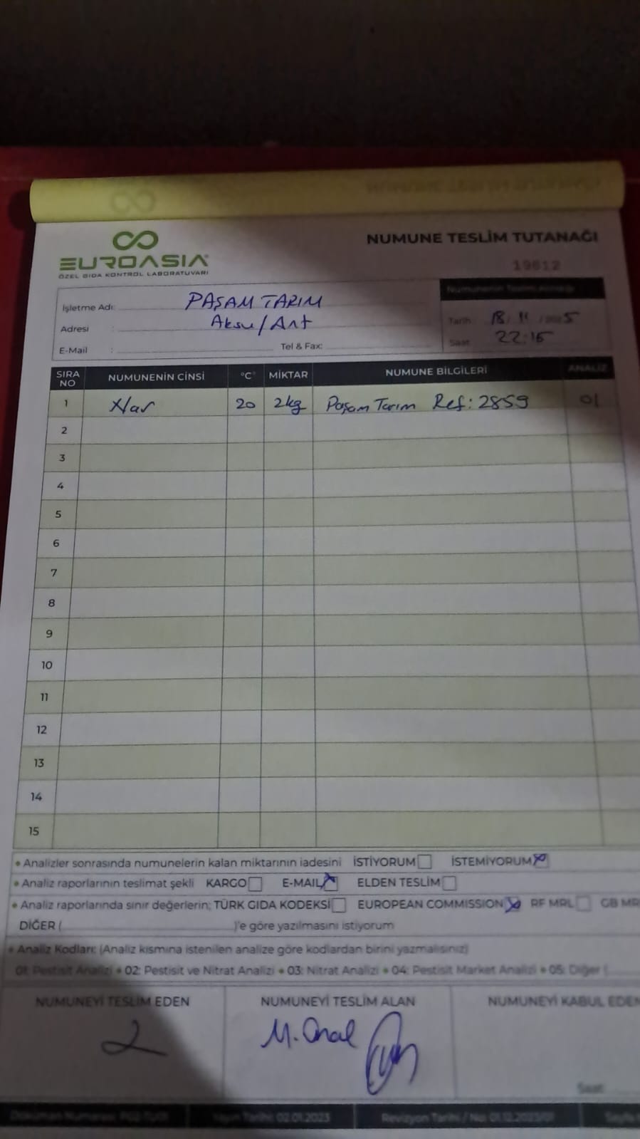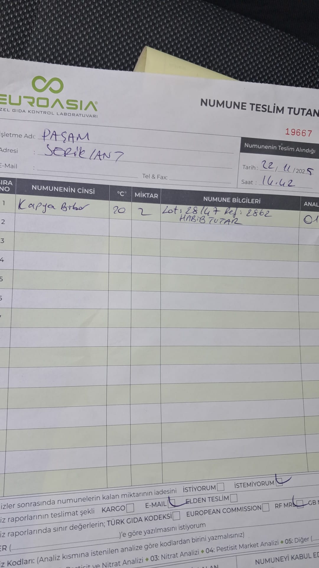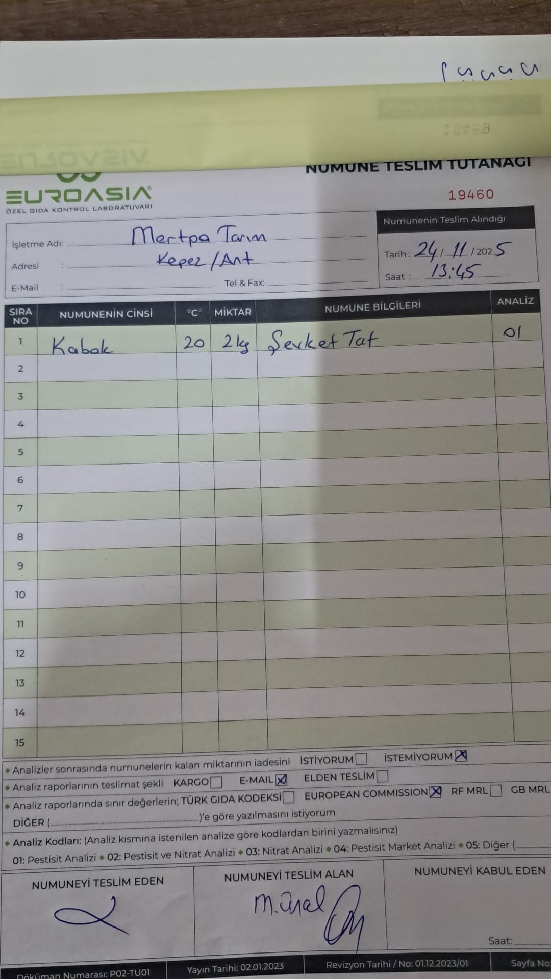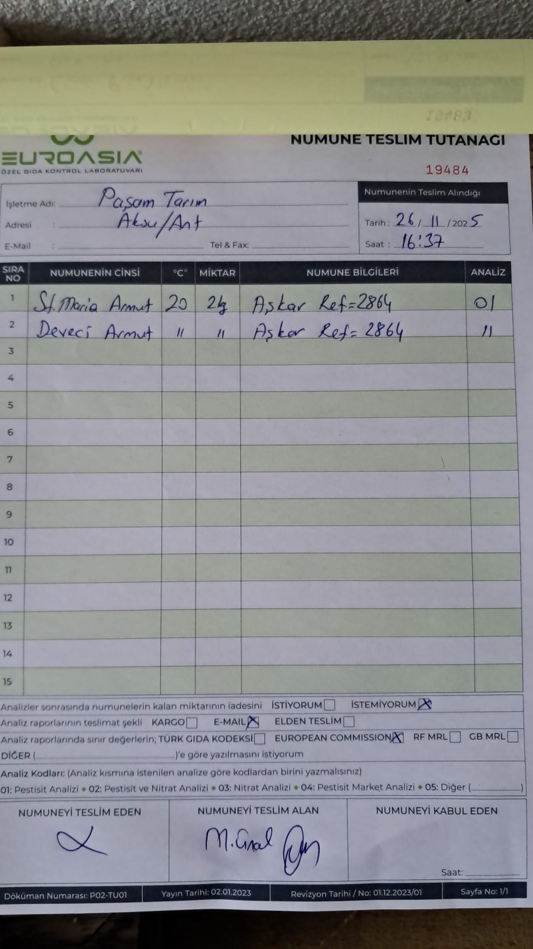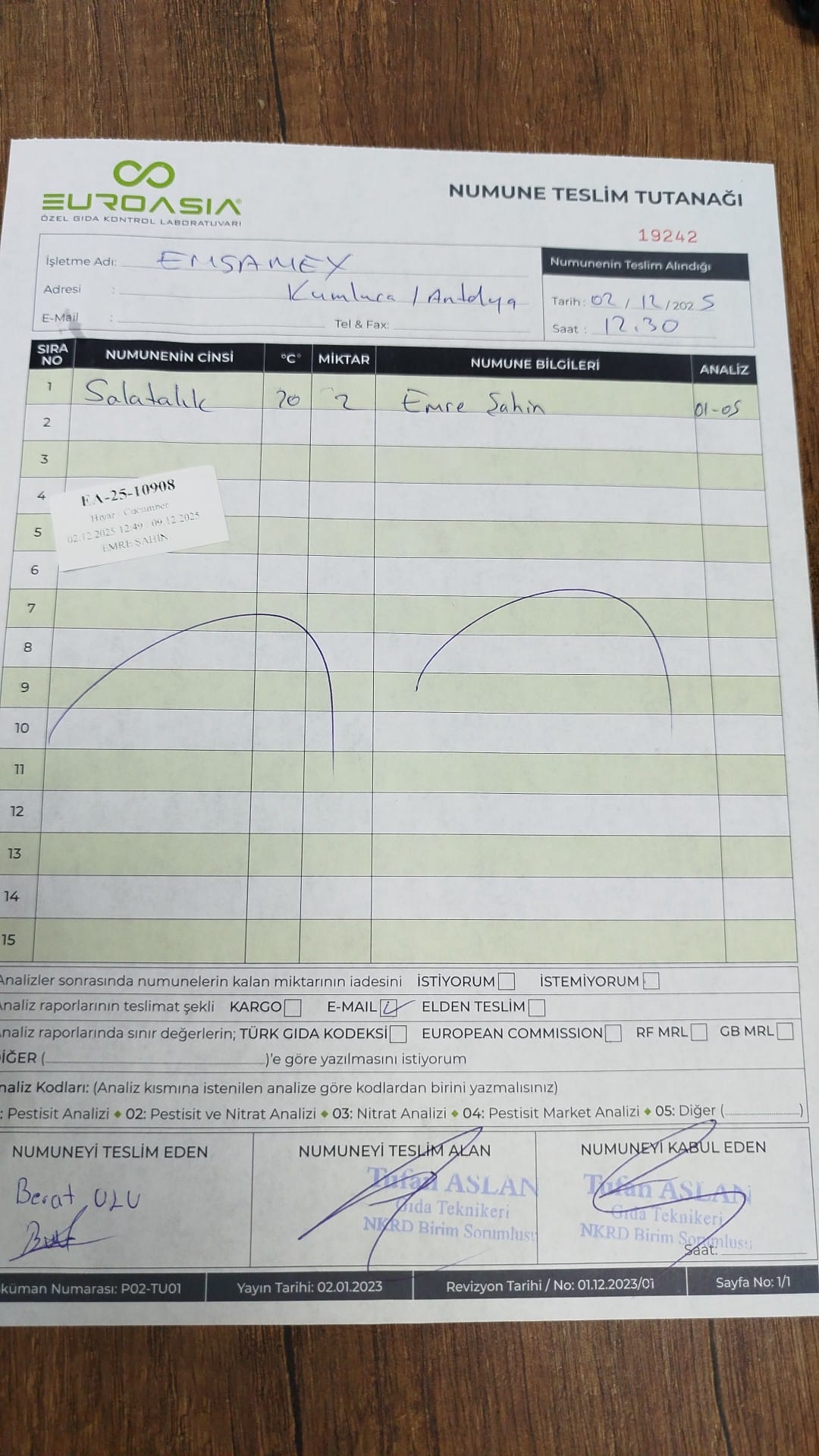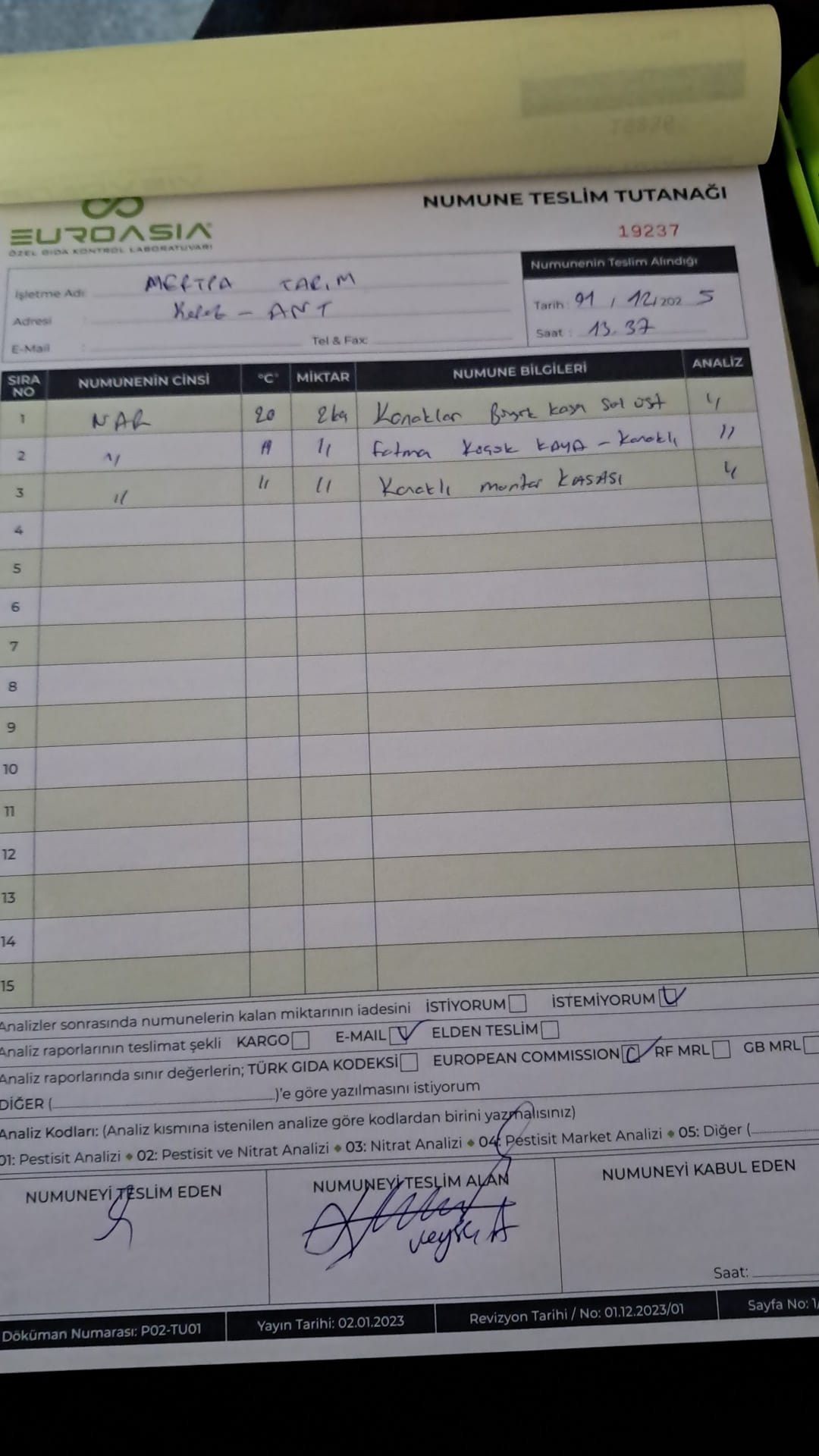 1 adet numune teslim alındı | 05.12.2025 21:52 | ||