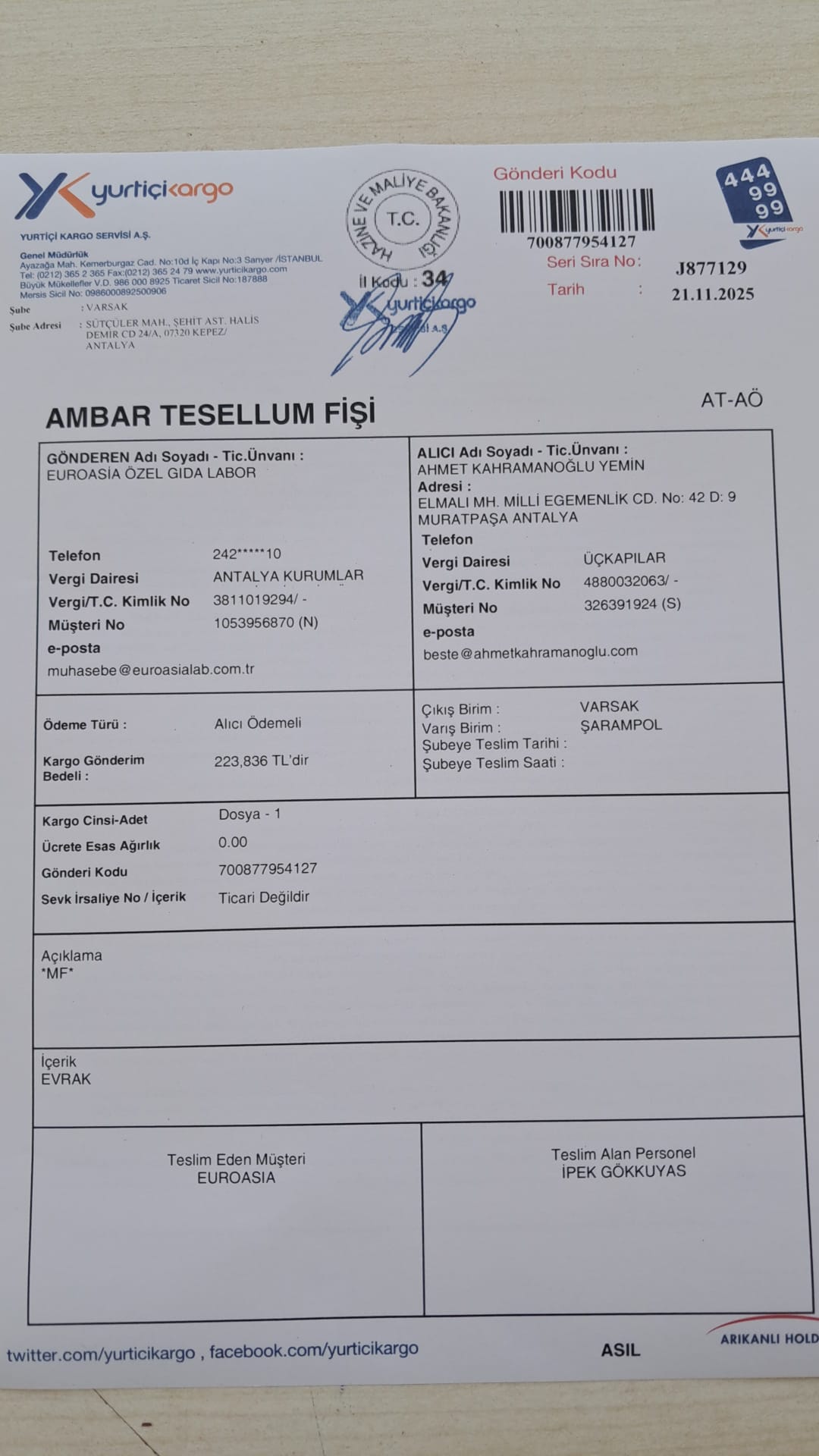 1 adet teslim alındı | 05.11.2025 12:50 | ||